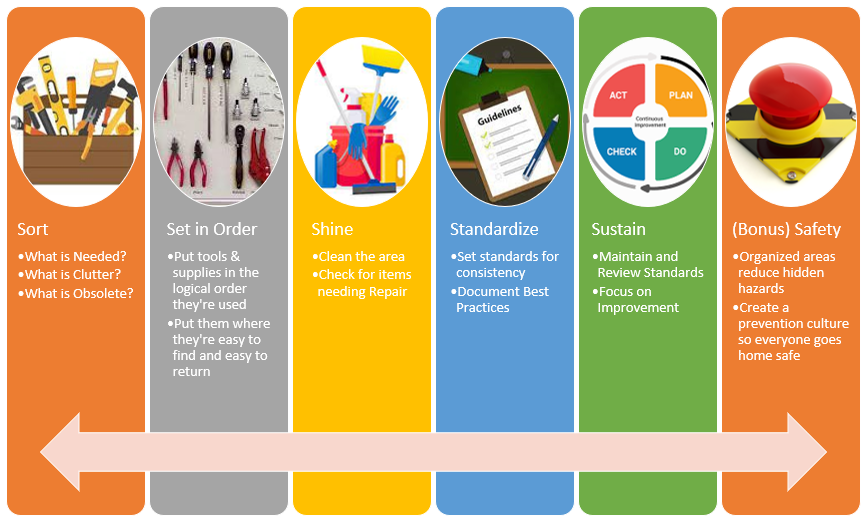 Any area can be improved by using 5S, from a manufacturing facility, to an office area, to your home shed or closet.